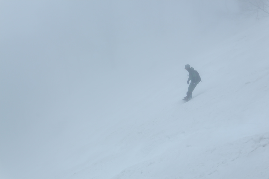 強めの北風が吹く中、8時半頃に雲が低い位置まで降りて来て、池の田序盤より上が濃いガスに包まれました。雪崩の危険も考慮され、スネーク、カモシカ、池の田林間、稗田山尾根、稗田山2、板平尾根、ジャイアント、稗田山林間下部がクローズに。適度に緩んだザラメ雪の圧雪の稗田山林間コースから稗田山コース1(写真)に入ると適度に緩んだ中~大サイズのコブが貼り付いていました。