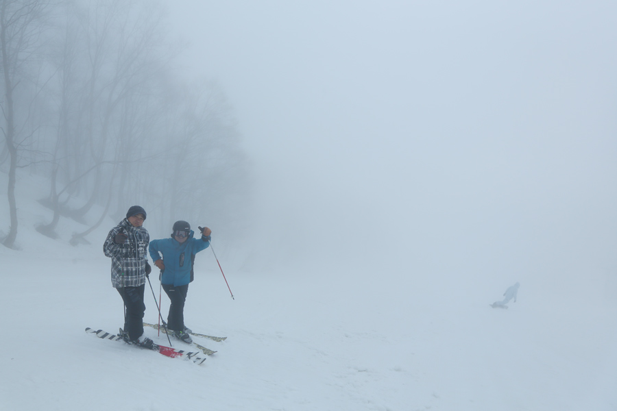 東京都からの男性(写真右)が「いつも見てます。Snownavi さんにお会いするのが初めてで、とても嬉しいです。」、写真左の男性が「僕は20年ぶりにスキーをしました。案外滑れるものですね。ウェアと板はすべて彼に借りました。」とお話しくださいました。池の田ゲレンデはシャラシャラのザラメ雪の圧雪でした。