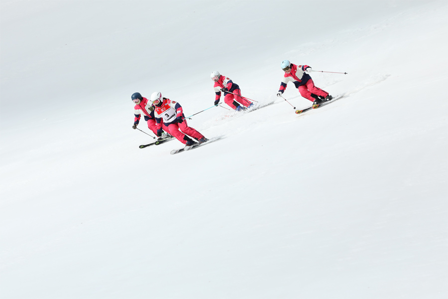 「全国学生岩岳スキー大会」(基礎スキーの部)が最終日を迎えました。自由な形と大きさで隊形を作ってスタートする「団体演技」は、その隊形をゴールまで維持する「規定演技」(写真)と、状況等に合わせて自由に隊形を変えられる「自由演技」の合計点で競われます。大会バーンのかもしかはシャラシャラのザラメ雪の圧雪でした。