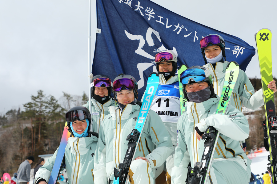 男子の規定演技1位は毎年優勝候補に名前が上がる 北海道大学エレガントスキー部 の皆さん(写真)。「約20台の車に分乗して、苫小牧から新潟までフェリーに乗り、そこから高速道路を使って白馬までやって来ました。片道2日かかります。このまま団体戦優勝を目指して頑張ります!」とお話しくださいました。