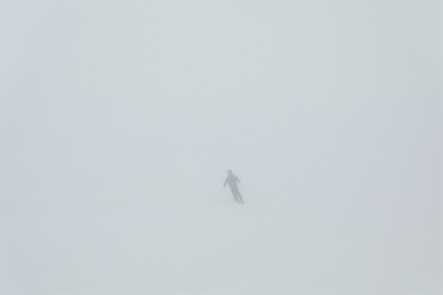マウンテンサイドは濃いガスに包まれて真っ白でした。サウスゲレンデ(写真)とサニーバレーコースは最初から緩んで、エッジが深く入るザラメ雪の圧雪。サニーバレーでは、序盤から積雪が薄くなっているところがポツポツ見られました。