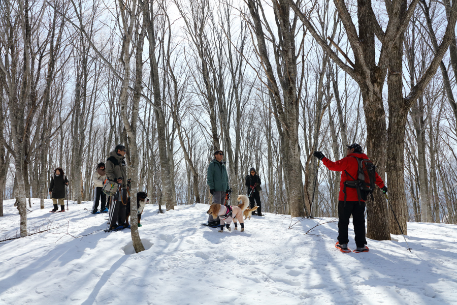 今朝10時からは「愛犬と行くスノーウォーク体験」(※事前予約制、先着10名様限定)が行われました。一行は山麓のベースセンターに集合した後、ゴンドラで山頂へと移動しティピーテント前でスノーシューを装着。準備が終わるとガイド役のスタッフさん(中央の赤いウェア)の案内でねずこの森へと入っていきました。