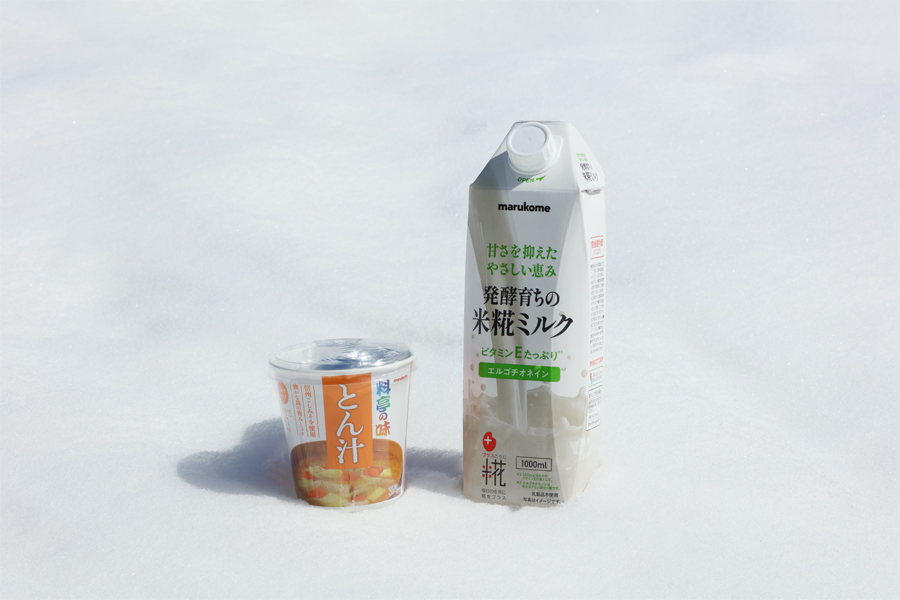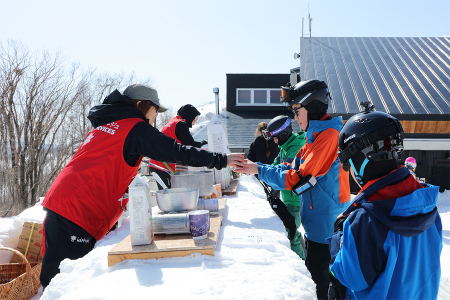 3/1(日)の11時から北尾根高原で企業タイアップ企画第2弾「とん汁&米糀ミルク」が行われました。今回無料配布されたのは長野県に本社を置く味噌業界の最大手、マルコメ株式会社の「プラス糀 米糀ミルク」が200人分、「カップ 料亭の味 とん汁」が300個。米糀ミルクはホットとアイスが選べて、とん汁は自分で封を開けて頂くスタイルでした。