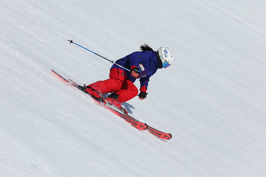 北向きのパノラマコース(写真)とルート8上部は良く締まったザラメ雪の圧雪。締まったザラメ雪の圧雪のグランプリコースは東向きとあって表面が最初から少し緩んでいました。いずれのコースでもエッジを効かせて思い通りのターンを繰り返せました。