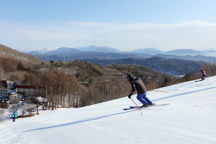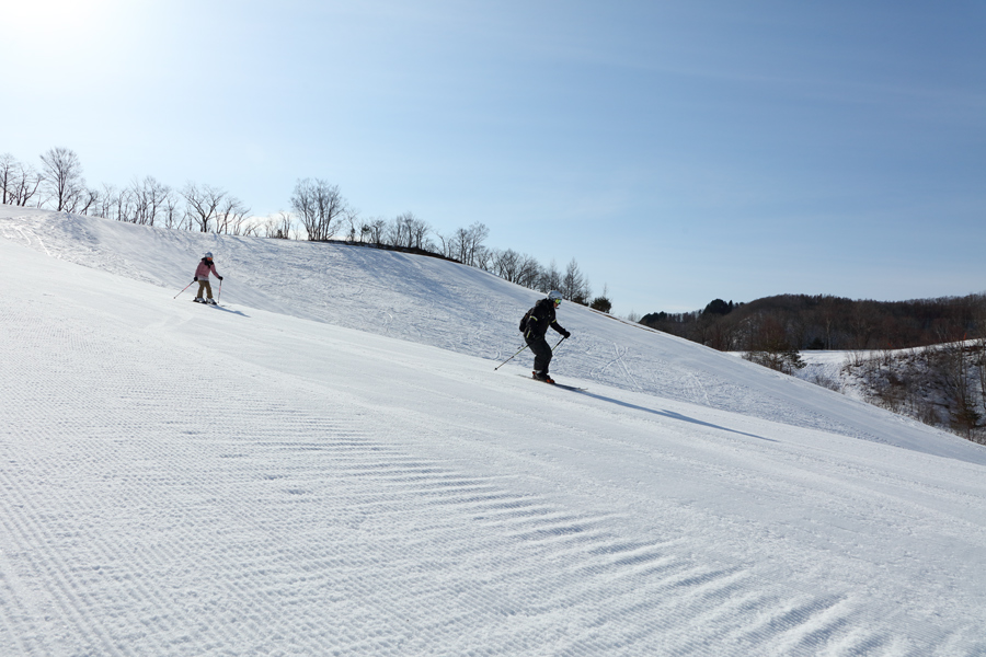 ザラメ雪の圧雪のコース5-A(写真奥)は序盤と終盤がよく締まり、中盤が緩んだコンディションでした。コース1-C(写真)と丸山ゲレンデはよく締まったザラメ雪の圧雪。緩斜面ながら板が走って気持ち良く滑れました(※左手に見えるウェーブには土の出た部分がありました)。