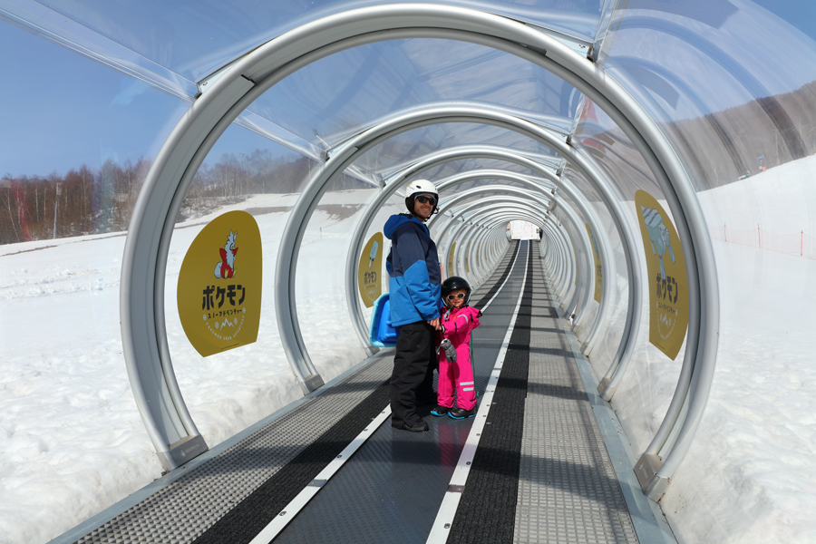 明日に久しぶりの雪予報が出ていますが、ポケモンスノーアドベンチャー のスノーエスカレーター(写真)はフード付きなのでいつでも快適です。外国人のご家族(写真)が「初めての来日です。滞在する4週間のうち白馬エリアには6日間います。今日は1日鹿島槍で遊びます。」とお話くださいました。
