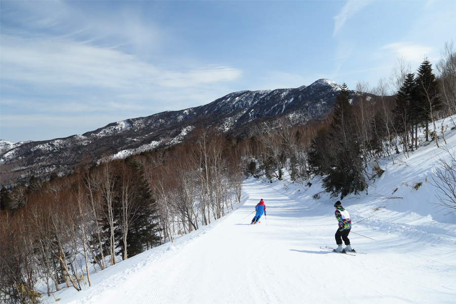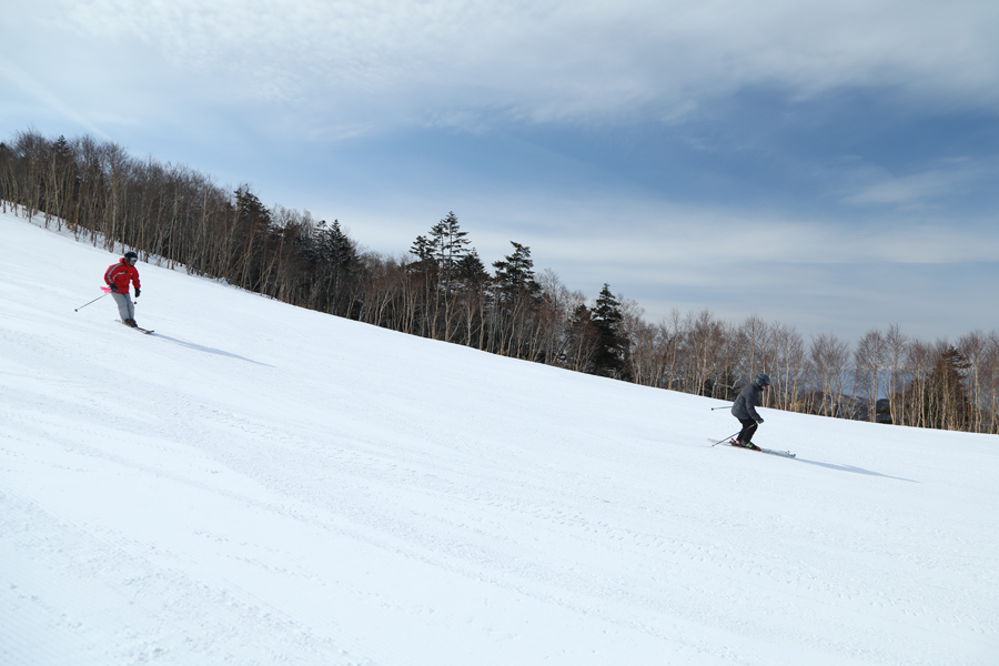 一の瀬ファミリーの正面ゲレンデ(写真1枚目)は硬くアイシーなザラメ雪の圧雪。エッジに乗るような感覚で大きく滑りました。3.2kmのロングコース、天狗コース(写真)は硬く締まったザラメ雪の圧雪で、緩斜面ながら板が良く走るコンディションでした。