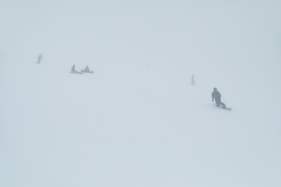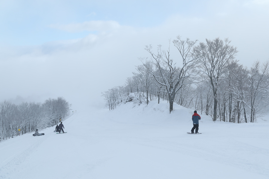 9時前にパノラマコースとルート8上部(写真)からガスが解け始めました。若干湿り気を感じる新雪が1~3cmトッピングされた両コースは適度に柔らかな、滑りやすい湿雪の圧雪。タイミングによっては北東に雲海を望めることもありました。