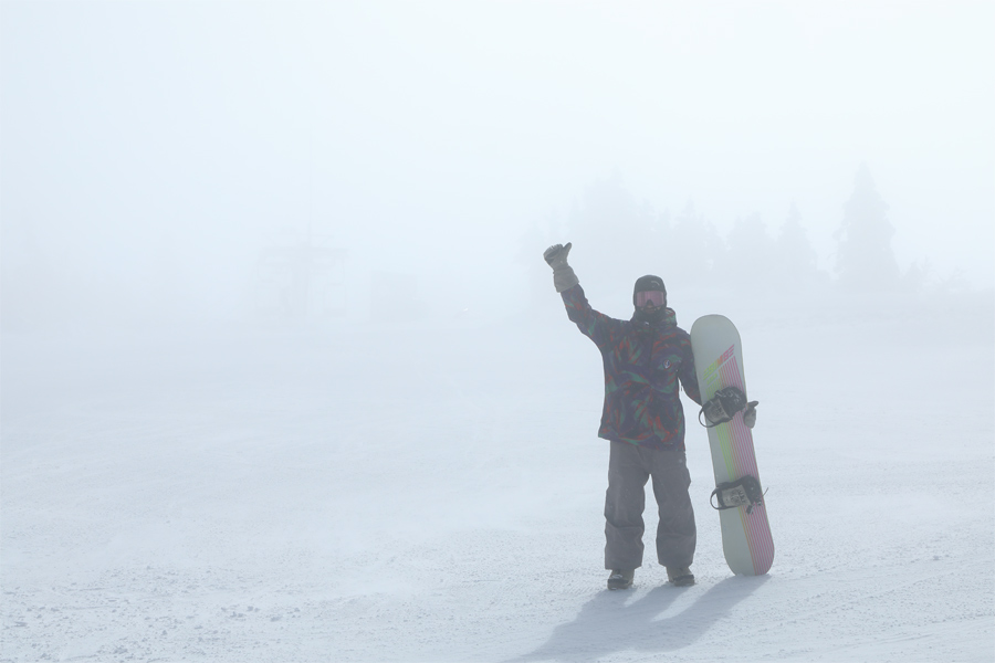 カメラをバッグに収めて第2ゲレンデを2本堪能した後、第2スカイリフト→第3スカイリフトに乗って横手山山頂へ。強風により雲とガスの流れが速くて、時々樹氷(写真)や青空を望めました。そのドラマチックな瞬間には近くの乗客から「おぉ、凄い!」といった声が上がっていました。