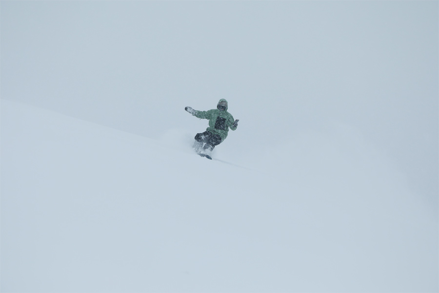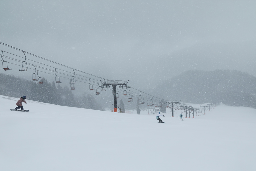 アルプス平では強めの冷たい北風に乗って雪が勢い良く降っていました。良く締まったザラメ雪の圧雪のグランプリコースとパノラマコースには若干湿り気のある新雪が5~10cm。非圧雪の硬い下地のアルプス第3ペア沿い(写真)では、新雪10~15cmでフカッとした感触を楽しめました!少々湿った新雪が2~3cm乗ったダイナミック、ウッディ両コースは良く締まったザラメ雪の圧雪でした。