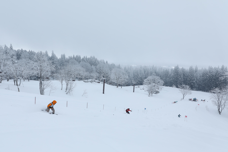 乾いた雪舞う中、時々北風も吹いて「-1℃」という公式発表気温より遥かに寒く感じました。3~5cmの新雪が乗ったユートピアAコースとBコースはザラメ雪が少し混ざった、適度に柔らかな湿雪の圧雪。「赤倉の乱」はユートピアAコースの中盤~終盤のスキーヤーズライト(写真)をセパレートして行われました。