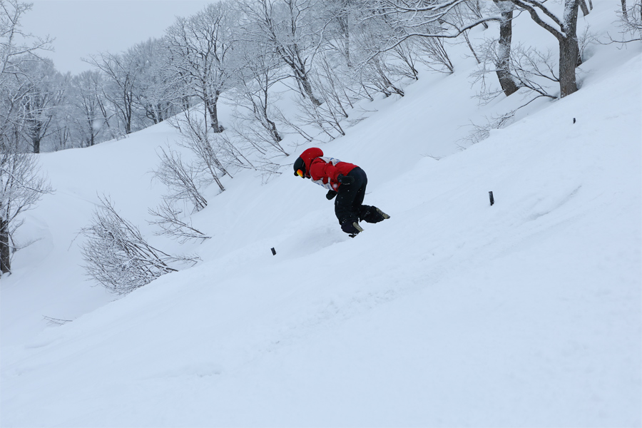この大会はスノーボードのコブ(不整地)滑走技術を競う歴史のある大会です。「スピード感」「ターンテクニック」「安定感」の3点に着目した総合評価で審査されます。9時からコースインスペクションが、10時から開会式が行われ、その後まもなく予選の1本目がスタートしました。