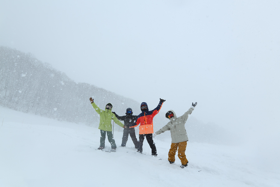 強めの北風に乗って少し湿り気のある雪が勢い良く降っていました。静岡県御前崎市からの4名様(写真)が「いつも見てます!久しぶりにハクノリに滑りに来ました。新雪がフカッとしていて気持ちがいいですね!」とお話しくださいました。
