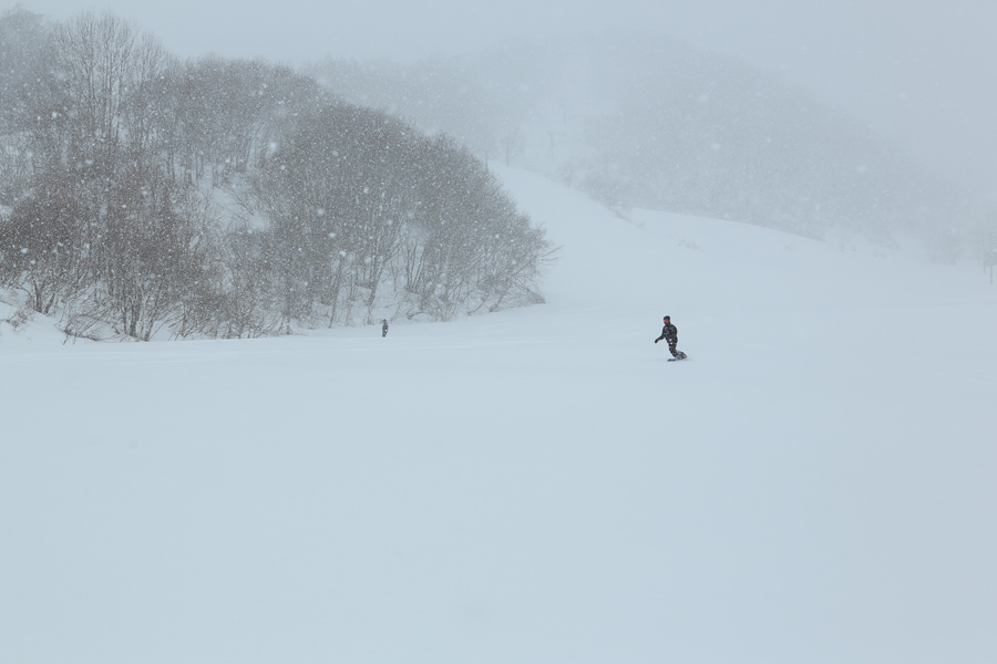 適度に締まったザラメ雪の圧雪に新雪が3~5cm乗った若栗中央ゲレンデ(写真)ではフカッとした感触を楽しみながら快適にターンを繰り返せました。新雪が約5cm乗ったハイウェイ、カモシカ両コースは硬めのザラメ雪の圧雪。須坂市からの男性(写真右の黒のウエア)が「Snownavi はたまに見てます。いつもは妙高に行くのですが、今日はのんびり滑りたいと思ってハクノリに来ました。」とお話しくださいました。