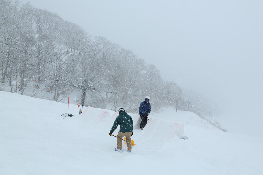 スタッフさん(写真)が「先週に大会で使われたモーグルコースを一般開放するために整備しています。今日はコブが硬いのでオープン出来るかな…」とお話しくださいました。適度に締まったザラメ雪の圧雪のラビットコースにも新雪が約5cm乗っていました。