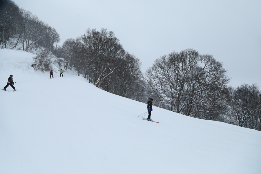 上部ゲレンデと下部ゲレンデをつなぐ貴重な緩斜面、林間コース(写真)はザラメ雪と湿雪が混ぜられプレスされ良く締まった圧雪でした。舞うように降っていた細かな雪の粒が10時頃に大きくなり、11時頃にその降る勢いが増しました。
