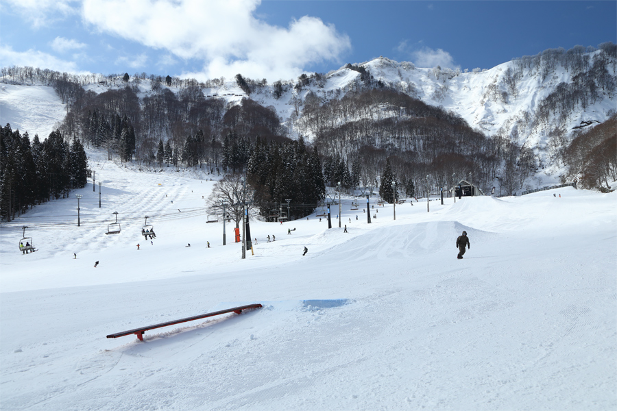 21のアイテムがレイアウトされた スノーパーク(写真)!整備が行き届き、湿雪にザラメ雪が少し混じる良く締まった圧雪バーンと相まって入りやすく感じました。尚、写真左奥のレグルスにはモーグルレーンが、MID BASE の南側にはハイクアップパークも整備されています。