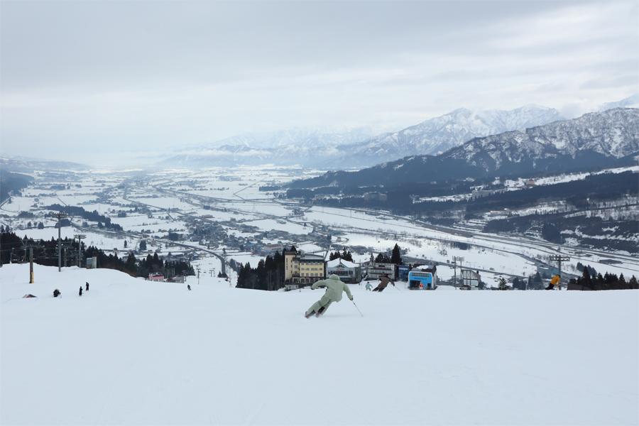 最大30度、平均13度、距離500mの大丸山ゲレンデ(写真)は適度に締まった湿雪の圧雪。滑り降りるにつれてザラメ雪が混じるようになり、大丸山バイパスに入ると適度に締まったザラメ雪の圧雪になりました。同様に適度に締まったザラメ雪の圧雪のパラダイスコース下部とグリーンコースは空いていました。