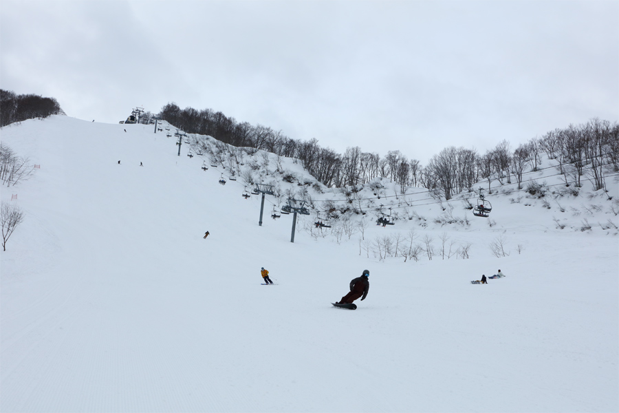 時々薄日差す穏やかで過ごしやすい曇天となりました。朝一番の銀座ゲレンデ(写真)、サンライズライン、ザイラーコースは適度に緩んだザラメ雪の圧雪。板がよく走る中、サンライズエクスプレスを使って気持ち良くウォーミングアップしました。