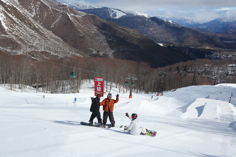 日本屈指のクオリティ、抜群の整備を誇る 47PARKS(写真)!雲の多い穏やかな晴天のもと上級レーン、中級レーン、初級レーンにレイアウトされた全19アイテムが今朝もキチッと仕上がっていました。白馬村在住のお2人(写真左と中央)が「いつも見てます!」の合言葉をくださいました。