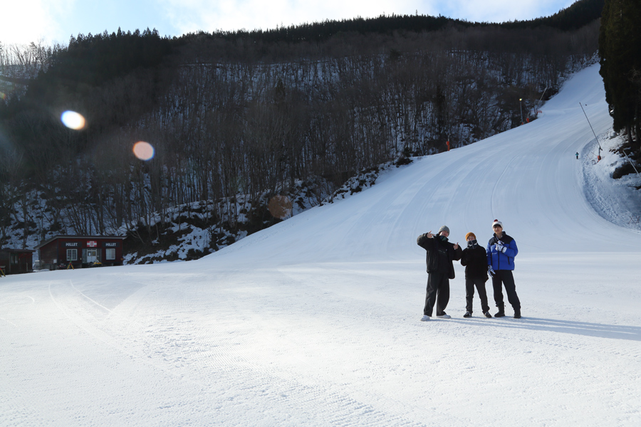 時間を戻して営業開始前に出会った大阪府からの3名様(写真)が「高校の卒業旅行で初めて五竜47にやって来ました。これから板とウェアを全部レンタルします。」とお話しくださいました。また、パトロールさんが「今日はほど良い冷え込みで、ルート1下部は硬すぎずとても滑りやすいです。」とお話しくださいました。