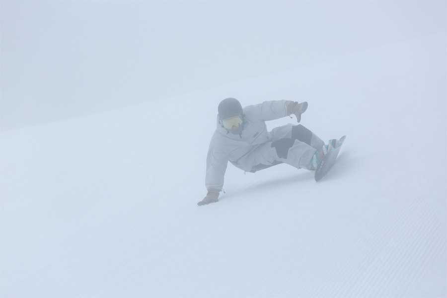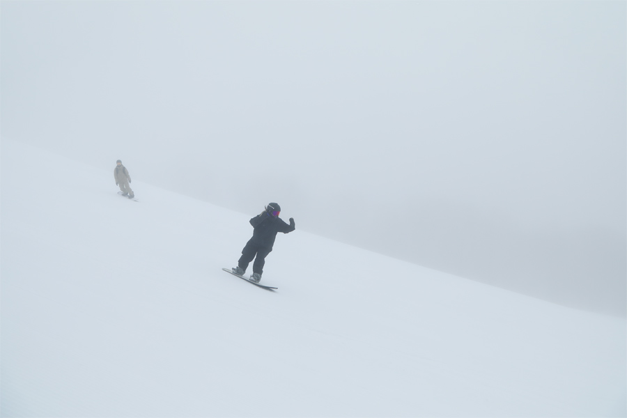 池の平クワッドでご一緒した山梨県からの男性が「いつも見てます。今日の圧雪バーンは勘違いしてしまうくらいに滑りやすいのに、ガスなので全力で楽しめないですね。」とお話くださいました。上質なグルーミングバーンだったクワッドコース(写真)は湿雪ながら粉雪感アリ。気持ちの良い滑り味に浸れました。