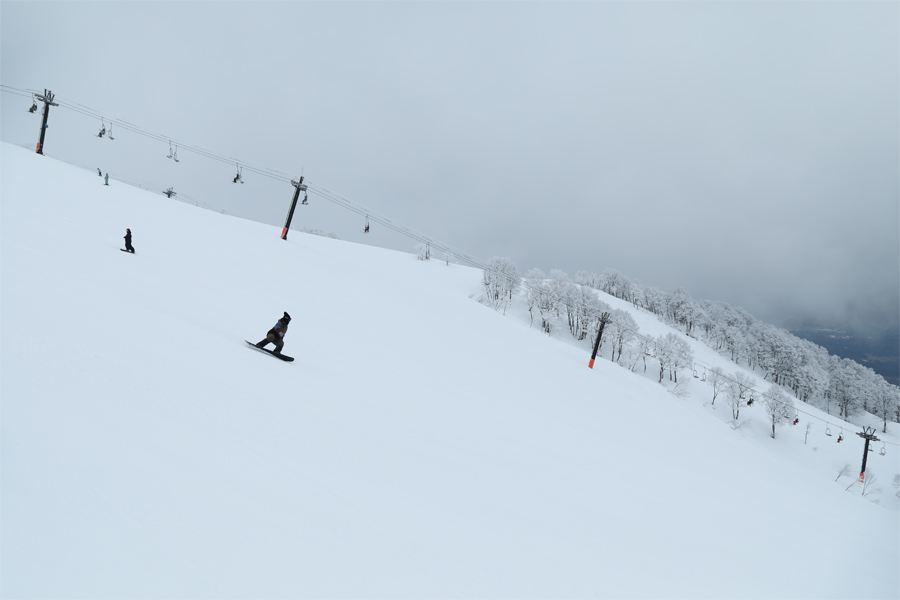 日差しがなかったことで表面が緩まず、長らく良好なバーンコンディションが続きました。「いつも見てます。思ったよりも冷え込んで、滑りやすいですね。」とはお会いした男性。ダイナミックコースは硬めのザラメ雪の圧雪、ウッディコースは良く締まったザラメ雪の圧雪でした。