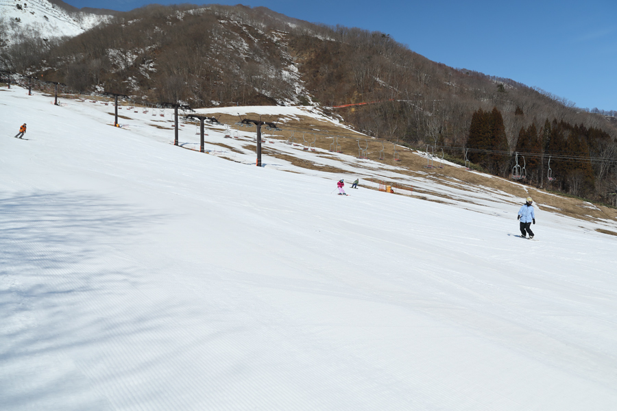 南向きのテクニカルコース、東向きのグランプリコースとは異なり、同じザラメ雪の圧雪でも北向きのパノラマコース(写真)とルート8上部は適度に締まったコンディションでした。東向きのダイナミックコースはシャラシャラのザラメ雪の圧雪、適度に緩んだザラメ雪の圧雪のウッディコース(※前半が北向き)は滑り降りて行くほどにシャラッとしました。