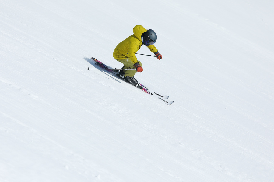 最初から表面が緩んでいた、適度に締まったザラメ雪の圧雪のグランプリコース(写真)は30分もするとシャラッとして来ました。板が良く走り、思い通りのターンを繰り返せるコンディション。珍しく圧雪が入っていたテクニカルコースもシャラッとしたザラメ雪の圧雪でした。