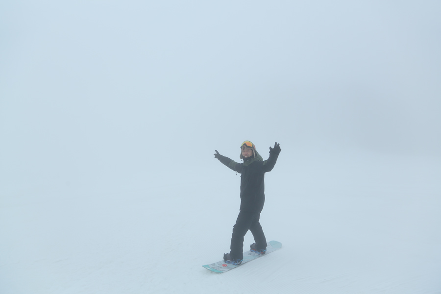愛知県からの男性(写真)が「いつも見てます。昨晩は車中泊していたのですが、雨の音がうるさくて眠れませんでした。今日は滑りやすいザラメ雪の圧雪ですが、ガスでスピードが出せないですね。」とお話しくださいました。雨がポツポツと降る中、マウンテンサイドは濃いガスに包まれていました。
