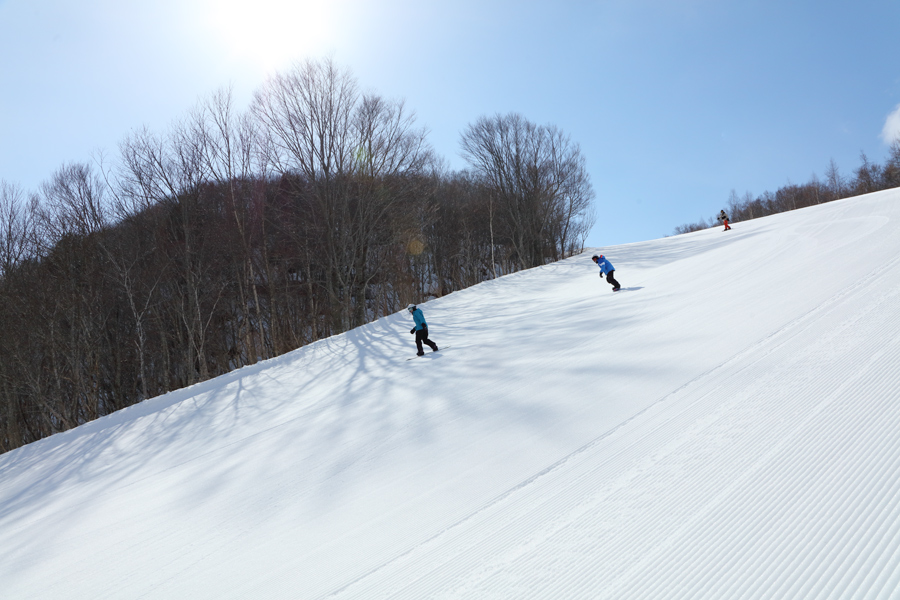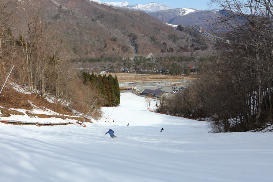 ザラメ雪の圧雪のルート1下部は日当たりの良い序盤が緩み、中盤~終盤(写真)がよく締まっていました。北向きかつ日陰になりやすい谷間、さらには人工雪のフォローが効いて、一番下まで積雪十分、ブッシュなし!コース幅いっぱいに圧雪が入っているので、ショートターンもロングターンも思いのままでした。