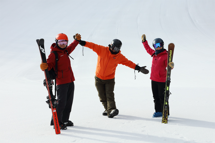 営業開始前にお会いした東京都からのご夫婦(写真両脇)と石川県からのご友人(写真中央)が「いつも見てます!雪が無くなるまで滑りに来るつもりです。」とお話くださいました。よく締まったザラメ雪の圧雪のルート8下部ではうっすらと霧氷が見られました。