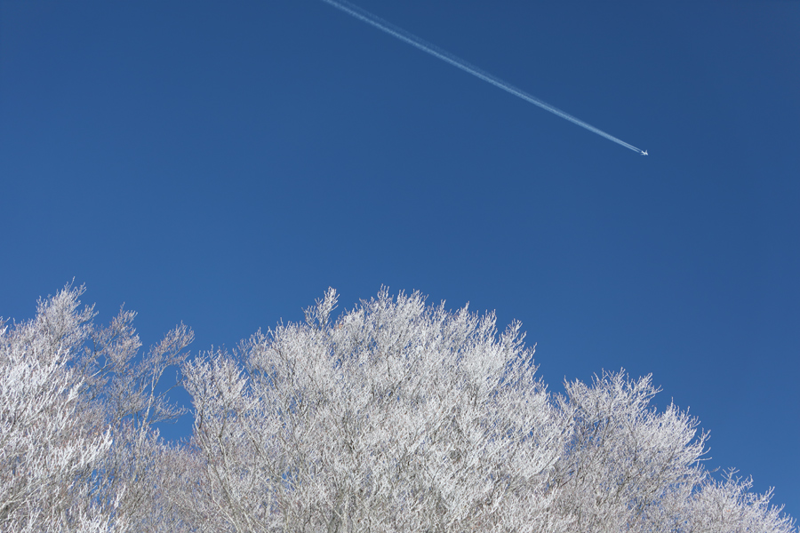 スキー場最上部の木々は霧氷に染まっていました。ちょうど飛行機が通ったところをパシャリ。ちなみに飛行機雲が空に長く残るのは、上空の空気が湿っていて、低気圧や前線が近づいているサインです。天気予報によると、今日の午後から曇りになり、明日の夜から明後日の朝にかけて雪が降るようです。
