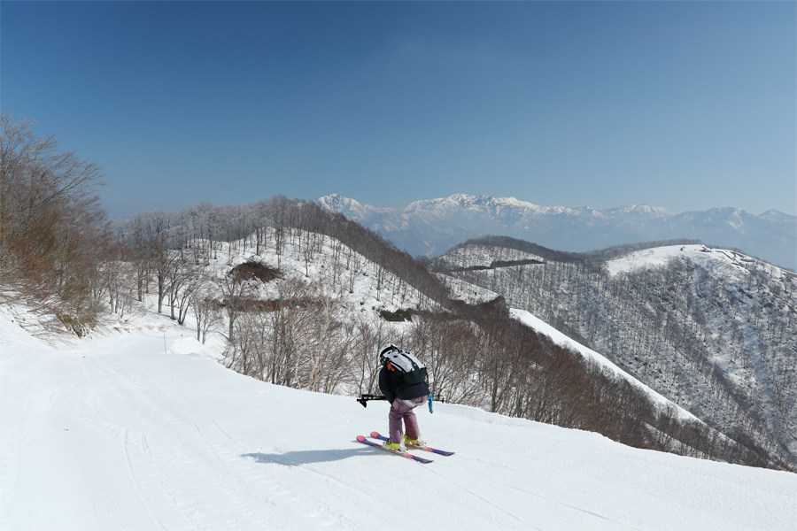 適度に締まったザラメ雪の圧雪の稗田山林間コース(写真)は、エッジの食いつき、板の走り共に良好でした。圧雪の板平コースは序盤が少し緩んだザラメ雪、中盤~終盤はシャラッと緩んだザラメ雪。積雪が少なくなって来ましたが、板平コースに土やブッシュが出たところはありませんでした。