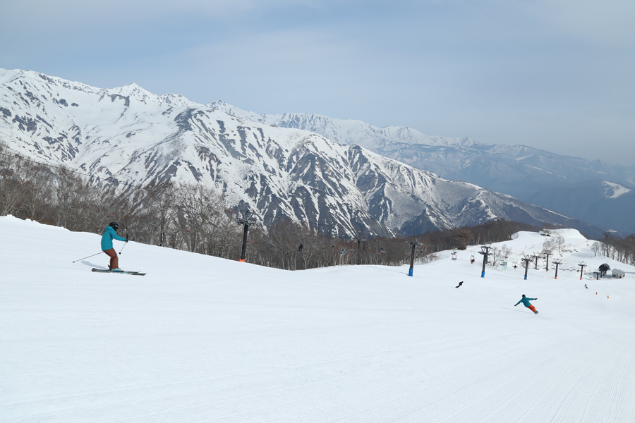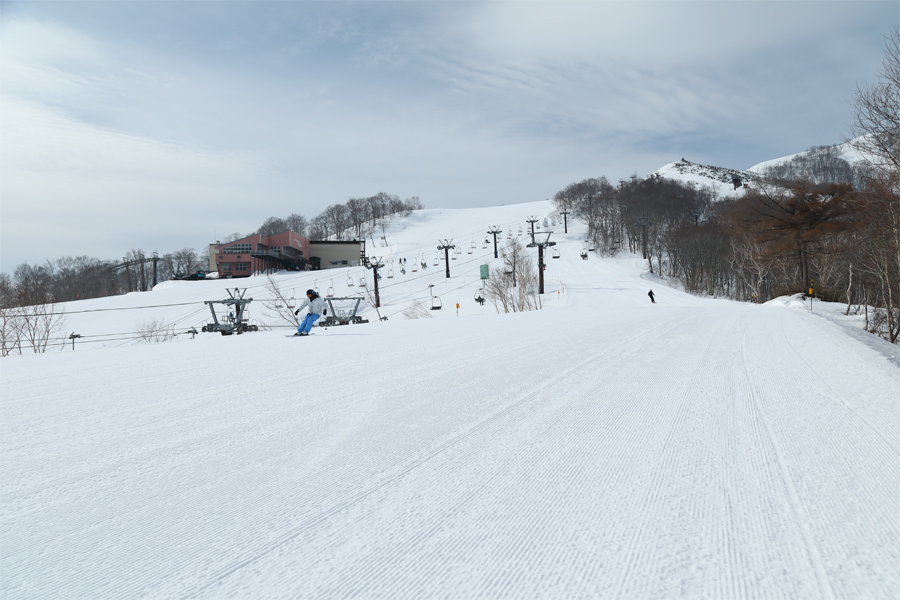 パノラマコース(写真)は適度に締まったザラメ雪の圧雪、グランプリコースは適度に緩んだザラメ雪の圧雪。良く締まった中~大サイズのコブが出来ていた非圧雪のテクニカルコースとアルプス第3ペア沿いでは表面が緩み始めていました。3/28(土)~3/29(日)にはこれらのコブを使って「GORYU BUMPS SPRING SERIES」が行われます。