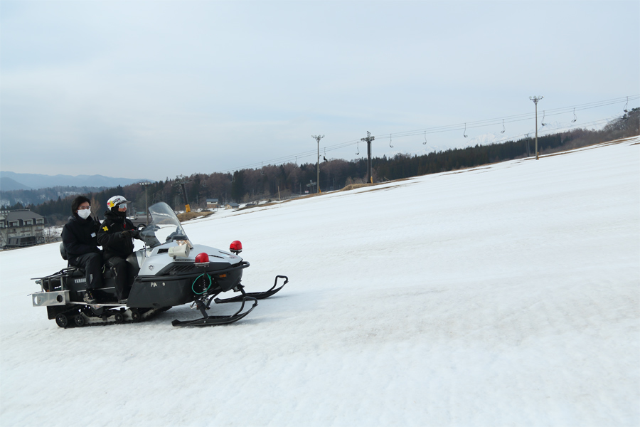 神奈川県からのご夫婦(写真はそのうちのお1人)が「愛犬と滑りたくて今シーズン3回目のハクノリです。この子は雪の上が楽しいみたいで、いつも元気よく走っています。」とお話しくださいました。はくのりファミリーコースもシャラッとした滑りやすいザラメ雪の圧雪でした。
