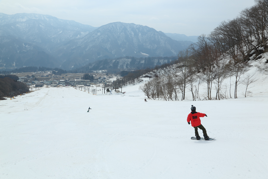 若栗中央ゲレンデ(写真)はシャラシャラに緩んだザラメ雪の圧雪、林に囲まれた若栗林間コースはシャラッとしたザラメ雪の圧雪でした。両コースの終盤は積雪が少なくなっていますが、第4ペア、第高速5ペア、第6高速ペアの各乗り場までは滑って行けました(但し、第6ペアには乗り場建物の北側を迂回してアクセスする形になります)。