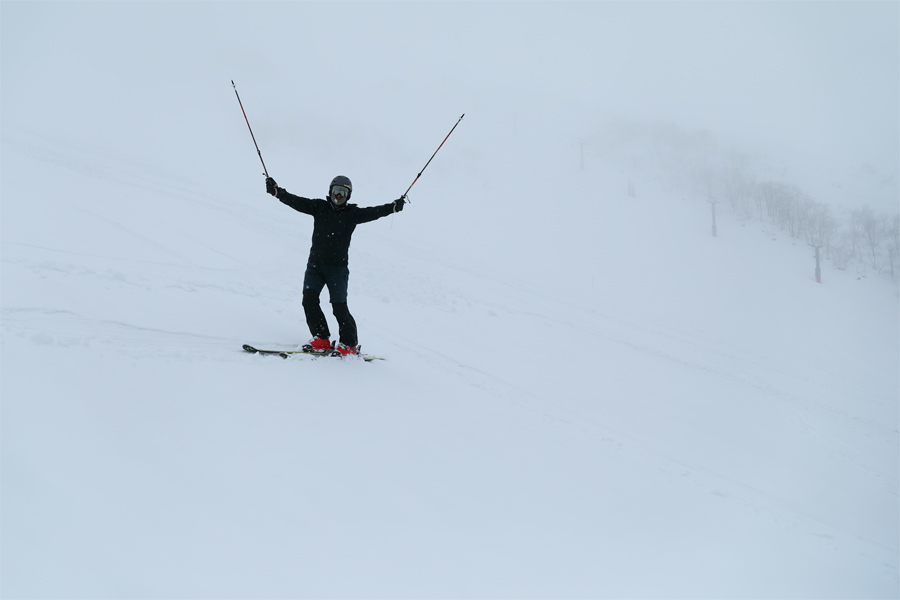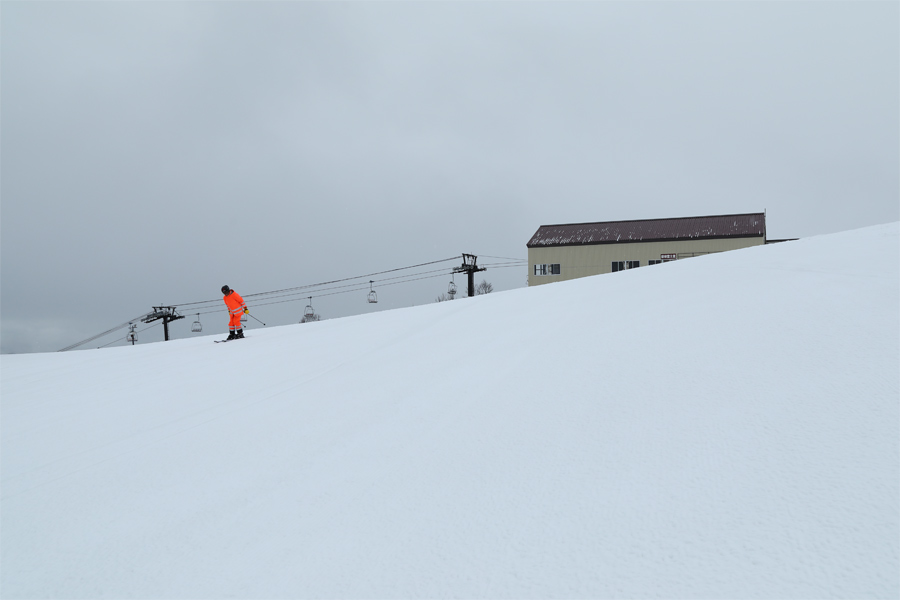 パノラマコース(写真)まで滑り降りると雪が雨に変わりました。黒菱とは対照的に、シャラッとしたザラメ雪の圧雪バーンは板が良く走るコンディション。ベースエリアまでブッシュや積雪の薄い箇所が全くない中、気持ち良くスピードに乗りました。