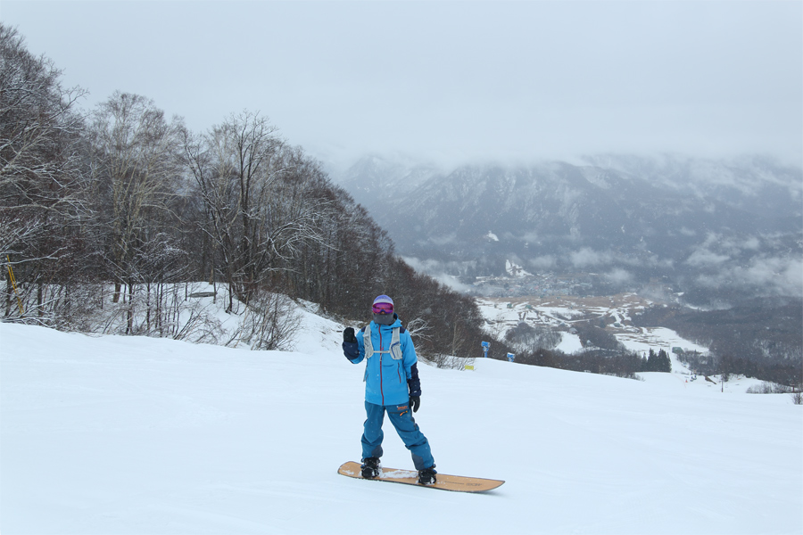 シャラッとしたザラメ雪の圧雪に湿った新雪が約1cm乗ったハンの木高速ペア沿い(写真1枚目)では板が良く走りました。白馬村在住の男性(写真)が「いつも見てます。今日は乗車中に雨に濡れないゴンドラで回せる つがいけ にしました。」とお話しくださいました(ナイス選択!)。