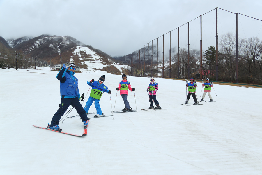 「協会で募集した小学生約30名と滑りに来ました。」とは横須賀スキー協会のインストラクターさん(写真一番左)。子供たちが「楽しいでーす!」と元気に話してくれました。親の原ゲレンデ(写真)はザクッとしたザラメ雪の滑りやすい圧雪バーンでした。