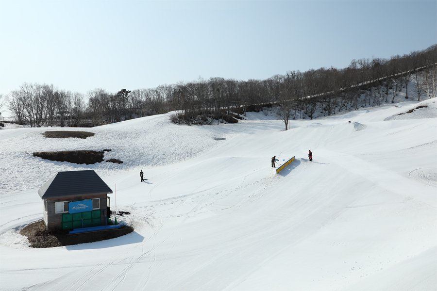 斑尾高原スキー場 の2025-26シーズンが今日、明日のラスト2日となりました。一部に土が出て来たとはいえ滑走可能コースには積雪が十分にあって、整備も最後の最後まで抜かりなし!霞みがかった空のもと FreeRidePark(写真)とジャイアントは最初からシャラッと緩んだザラメ雪の圧雪でした。