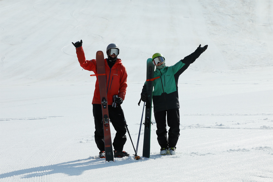 クリスタルコース沿いのリフトは既に終わっていますが、スーパークワッドリフト等を使ってクリスタルの中~下部を滑れます。「いつも見てます。朝イチはもう少し締まったバーンを期待していました。板は走ってくれて良かったです。」とは群馬県からの男性(写真左)。9時頃で緩み始めのザラメ雪の圧雪だったクリスタル(写真)では、日陰の時間が長いスキーヤーズライトが硬めでした。