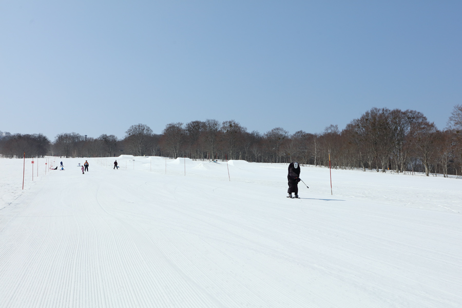 超ワイドなパラダイスゲレンデ(写真)は緩んだザラメ雪の圧雪。1~2本目はパラダイスフォー寄りを、3本目はきれいな雪面がたっぷり残っていたスキーヤーズライトを滑りました。上ノ平、パラダイス共にフラットで滑りやすい緩斜面ですが、一気に滑れば3.2kmもあるため滑走満足度はかなり高かったです。