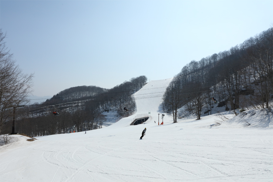 心地よい春の陽気の日曜日。朝イチの、良く締まったザラメ雪の圧雪のルート5(写真)を気持ち良く滑り出しました。次に滑ったザラメ雪の圧雪のルート8下部は序盤がよく締まり、中盤~終盤が硬くて凸凹したところもあるコンディションでした。