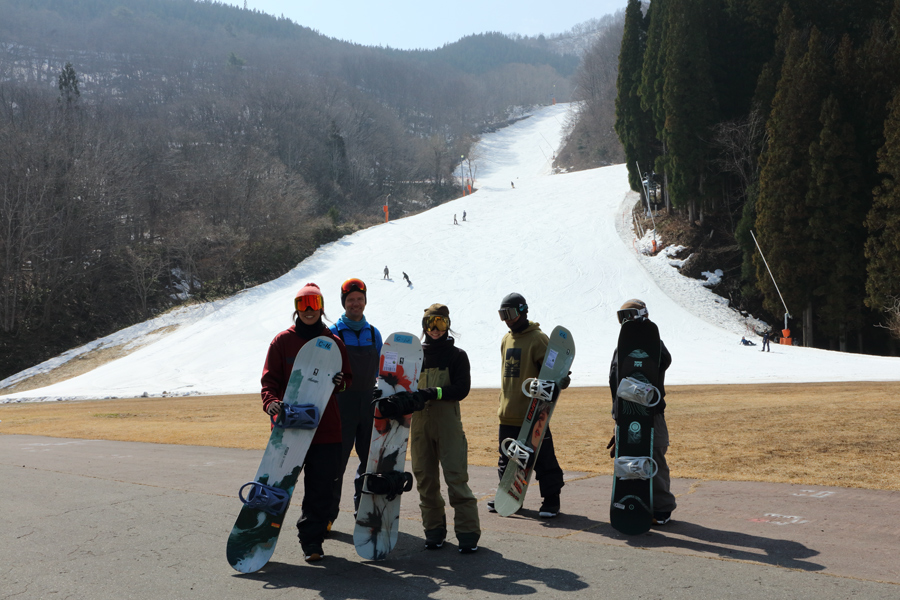 買いたい板が見つかれば、その場での注文も可能。白馬村在住のスノーボーダーさん(写真一番左)が「お目当ての板に乗ろうと予約してやって来ました。丸1日試乗して品定めしたいと思います。」とお話くださいました。尚、ビンディングは自分で取り付けてもスタッフさんにお願いしてもOKでした。