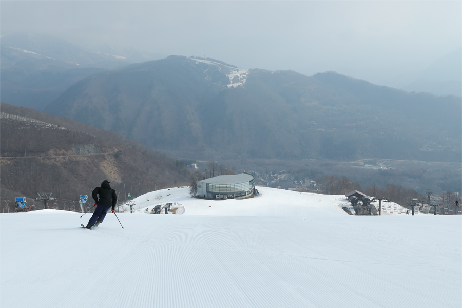 パノラマコース(写真)は最初からシャラシャラに緩んだザラメ雪の圧雪。終盤(写真)までしっかり積雪があり、整備も良かったので、バーンが荒れて来る前に何度も滑り込みたくなりました。神奈川県からの男性が「いつも見てます。先日のレポ ではありがとうございました。おかげさまで友人は無事退院出来ました。」とお話しくださいました。