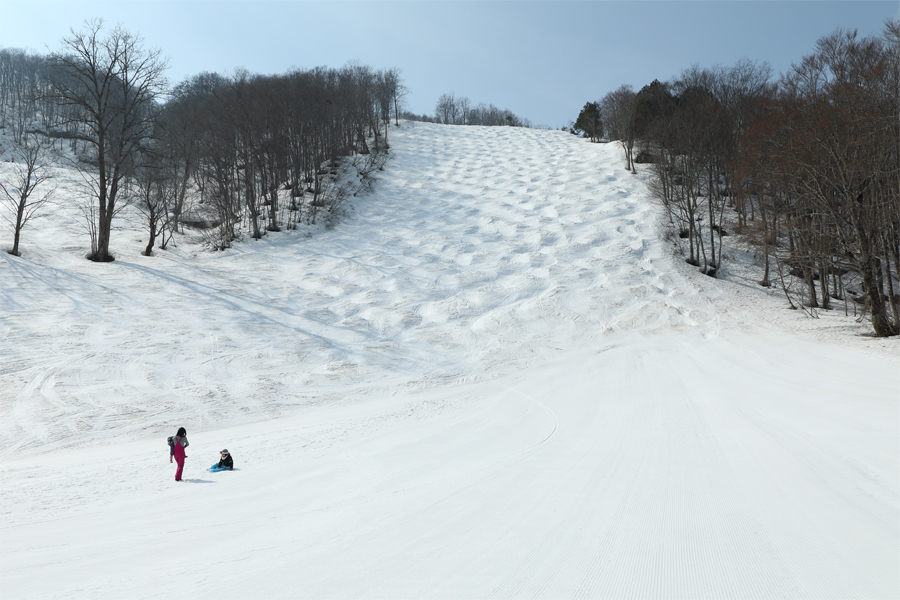 ルート3(写真)には全面にコブがビッシリ貼り付いていました。日の当たるタイミングがワンテンポ遅いルート8下部は9時頃で緩み始めのザラメ雪の圧雪。最後に滑ったルート1下部は緩んだザラメ雪の圧雪で、前半に積雪の少ない箇所がありました。