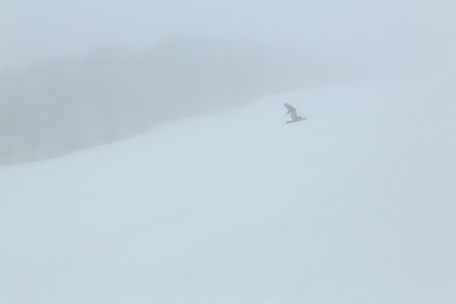 ハンの木高速ペア沿い(写真)は水分を含んでしっとりとしたザラメの圧雪でした。「たまに見てます。バンクドスラロームを滑れりたくて来ましたが、ガスでコースが分かりません。」とはお会いした長野市からの男性。バーン自体は板が良く走って滑りやすかったです。