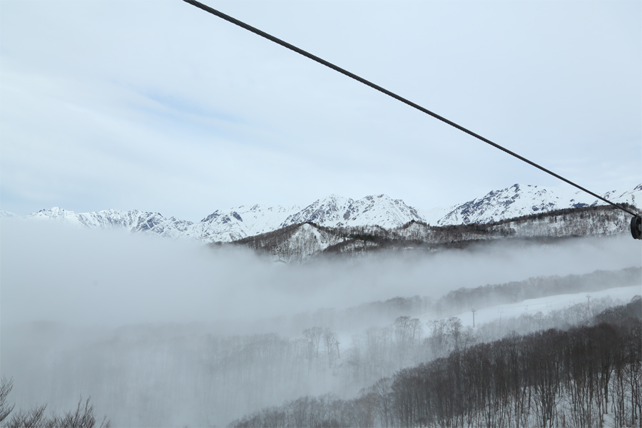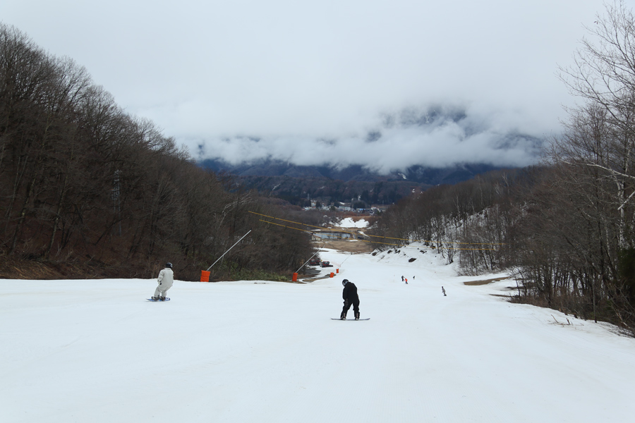 シャラシャラとしたザラメ雪の圧雪のハンの木中盤~終盤(写真)では滑り降りるほどに緩んだ層が厚くなりました(※ゴンドラ中間駅の50mほど手前で雪が切れています)。営業開始後のスキー場上部はガスに包まれていましたが、朝一番のゴンドラ乗車中には南方に雲海を望めました(写真)。