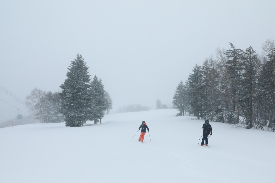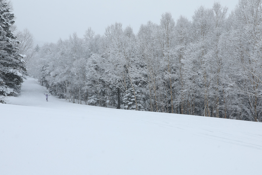 適度に締まったザラメ雪の圧雪のジャンスラには湿った新雪が5~10cm。ストップスノーかと思いきや滑走性が高くて、久しぶりの新雪を気持ちよく味わえました。ゴンドラ迂回コース(写真)を経て第1ゴンドラ山麓駅までブッシュや積雪の少ない箇所が全くない、滑りやすいコンディションが続きました。